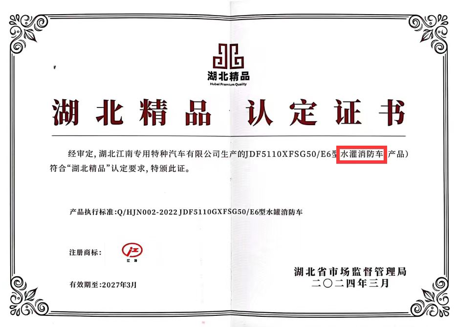 江南JDF5110GXFSG50/E6型水罐消防車獲得“湖北精品”榮譽稱號